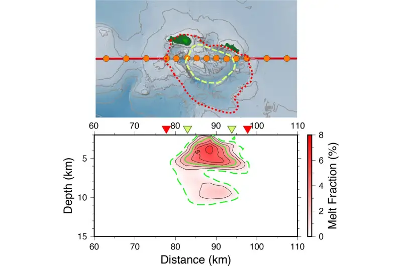 इसमें पिघले हुए मैग्मा (melt fraction) की मात्रा महज 3 से 6 प्रतिशत तक आंकी गई है। इसका सीधा मतलब है कि यह हिस्सा पूरी तरह तरल नहीं है, बल्कि चट्टानों के बीच कुछ प्रतिशत ही पिघला हुआ है। Credit: A. Nagaya et al. (2026), Communications Earth & Environment (DOI 10.1038/s43247-026-03347-9)